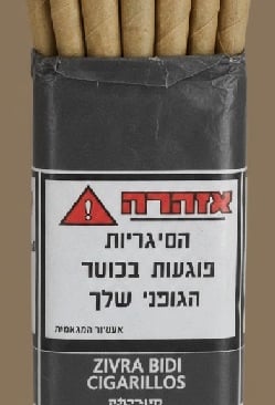 Region-specific health warnings in local languages (e.g., French, Arabic, Spanish, Hebrew, and English)